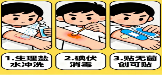 - 用碘伏或医用酒精消毒伤口及周边皮肤,待干后贴上创可贴或用无菌纱布简单包扎。